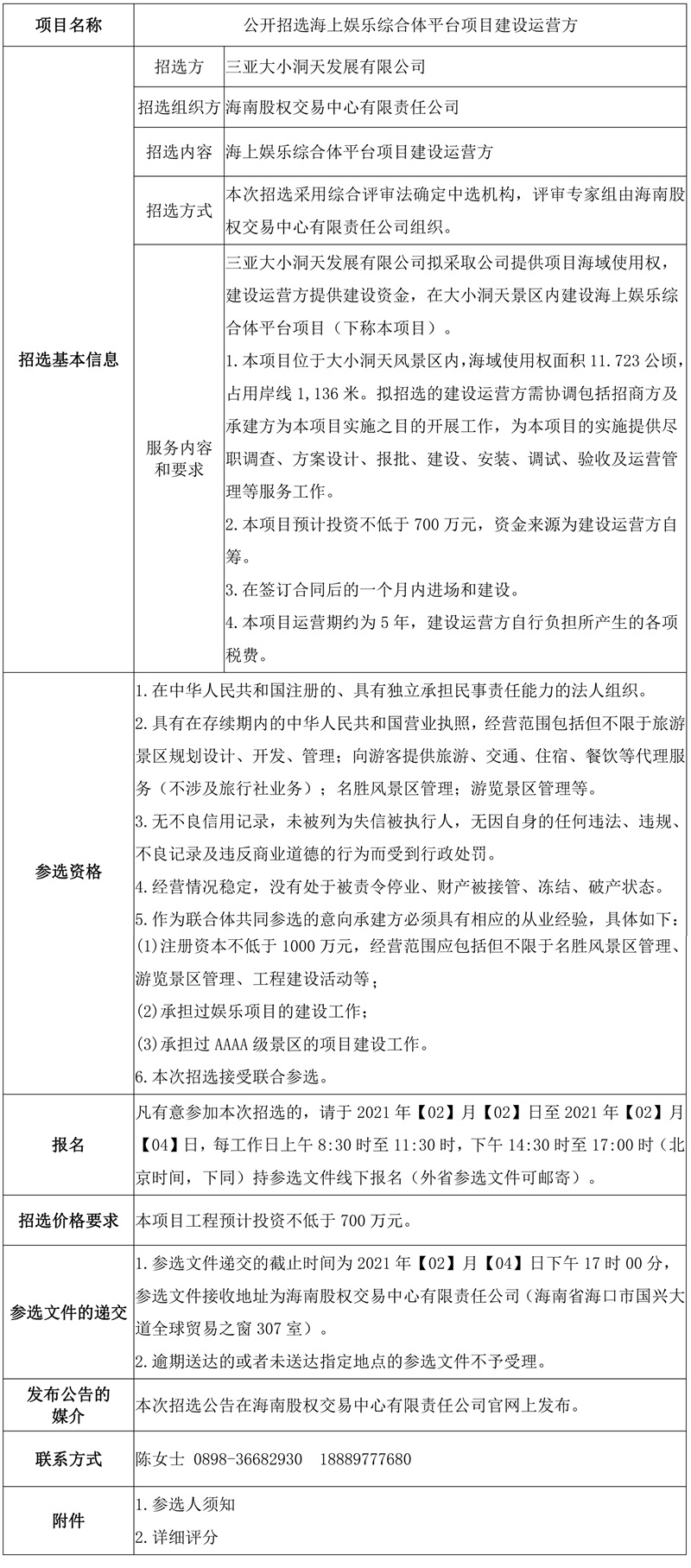根據(jù)相關(guān)法律法規(guī),受委托,海南股權(quán)交易中心有限責(zé)任公司公開(kāi)招選海上娛樂(lè)綜合體平臺(tái)項(xiàng)目建設(shè)運(yùn)營(yíng)方,為三亞大小洞天景區(qū)的海上娛樂(lè)綜合體平臺(tái)項(xiàng)目提供盡職調(diào)查、項(xiàng)目報(bào)批、建設(shè)、生產(chǎn)、安裝、調(diào)試、驗(yàn)收及運(yùn)營(yíng)管理等服務(wù)工作。歡迎符合條件的機(jī)構(gòu)遵照本公告的有關(guān)規(guī)定報(bào)名參加,現(xiàn)將有關(guān)事項(xiàng)公告如下: