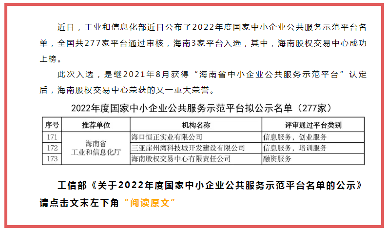 海南股權(quán)交易中心入選工信部“2022年度國家中小企業(yè)公共服務(wù)示范平臺(tái)”